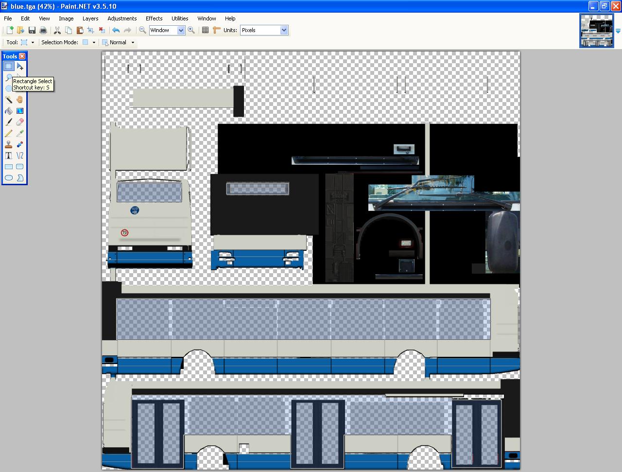 Po otvorení spomínaného ľubovoľného skinu klikneme na "rectangle select", a označíme to, čo je na obrázku označené modrým, teda okná. Po označení by to malo vyzerať približne rovnako, ako na obrázku. Potom známy "zákon" ctrl+c, zavrieme súbor, a otvoríme nový skin, ktorý ste si spravili. Samozrejme, tiež cez Paint.net. Tu využívame druhý "zákon" ctrl+v, a po nakopírovaní okien do skinu skin uložíme do *.tga. Samotné načítanie skinu do hry je rovnaké, ako pri ostatných autobusoch.
