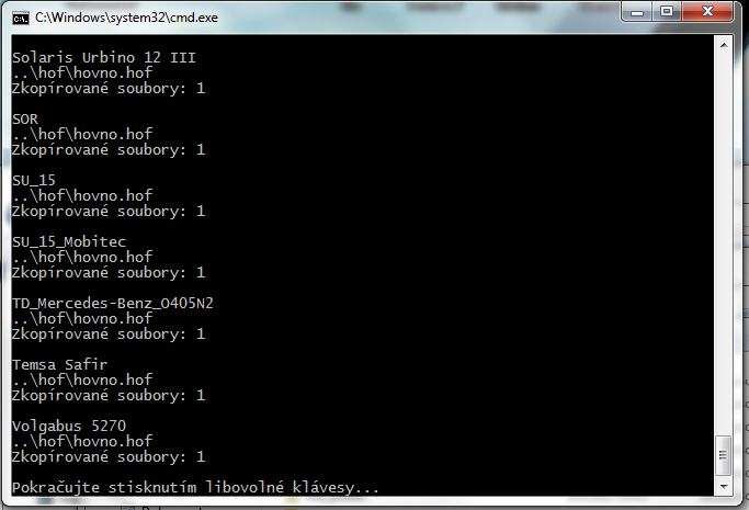 5) Proběhne kopírování .hof souboru (souborů) do složek s autobusy. Po skončení bude okno programu vypadat zhruba takto:
